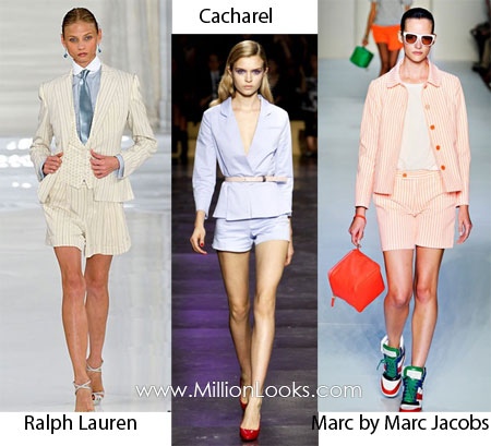 Spring/ Summer 2012 Fashion Trend : Summer suits. Summer suits can hardly be worn to a real office but they look so smart and stylish that ladies will still rock them. Made in a variety of colors and prints summer suits can come trimmed with lace which looks very cute. And while designers team those up with shirts and ties you can experiment with different items in your wardrobe to create the unique look.