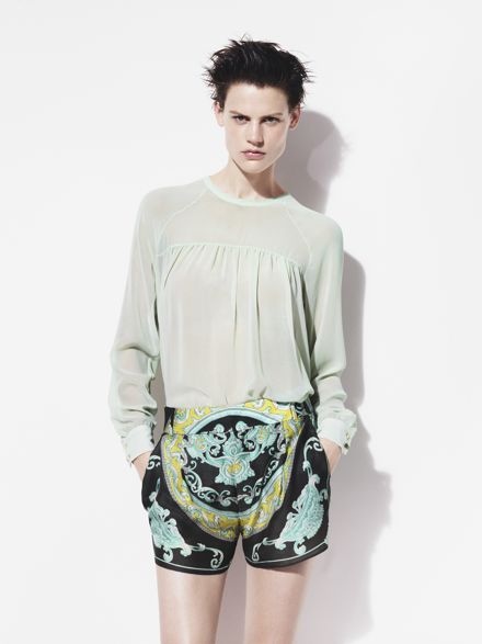 Here’s the ZARA Spring Summer 2012 press catalog, which gives us a taste of some of spring’s top runway-to-real-way trends. Some of the trends I can get behind include mint green, sheer fabrics (layered, of course) and floral prints. Some of the trends I can not: Thigh-high slits and mesh. For the reader who recently emailed me with a request for affordable floral print jeans, Zara TRF is your answer (that’s Zara’s lower-priced casual women’s line). Keep scrolling, you’ll see! I can’t believe I’m saying this, but I am ready to give printed pants a try. Who’s with me?