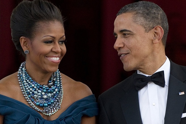 Mrs. O, wearing the deepest shade of teal in a column silhouetted Marchesa gown draped off-the-shoulder, paired her understated glam look with a statement Tom Binns necklace.