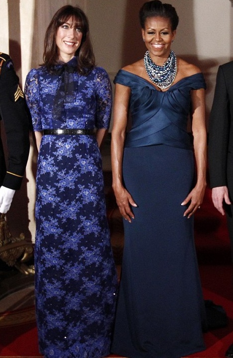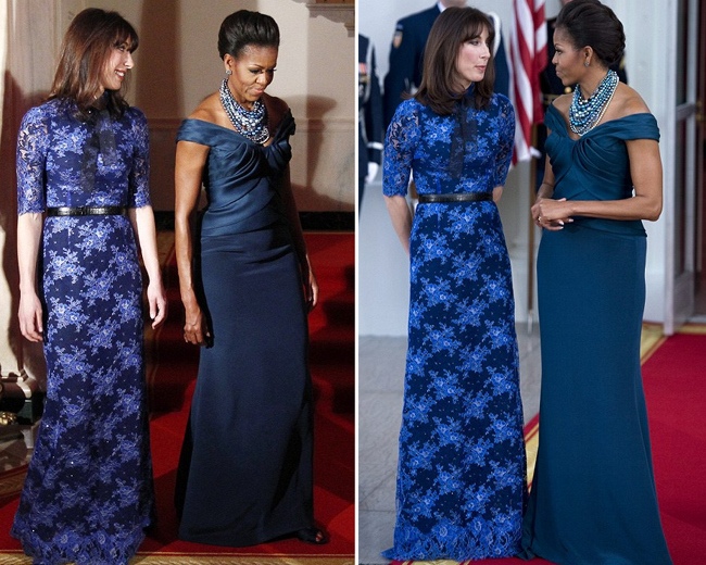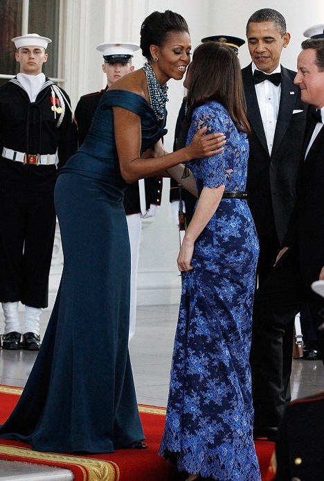 First Lady Michelle Obama had on blue the other night. But in the most regal way possible. As she and her Presidential husband welcomed British Prime Minister David Cameron & his wife Samantha Cameron, Mrs. Obama made a statement in an off-the-shoulder Marchesa evening gown.