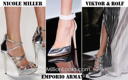 Metallic shoes is one of the biggest trends for Spring/Summer 2013. Silver foil shoes and sandals were all over the runway during Fashion Week spotted at Nicole Miller, Emporio Armani, Giambattista Valli’s fashion shows. At Moschino heeled sandals were decorated with crushed crystals and metallic leaf plates while at Viktor & Rolf metallic pumps were made of textured material.