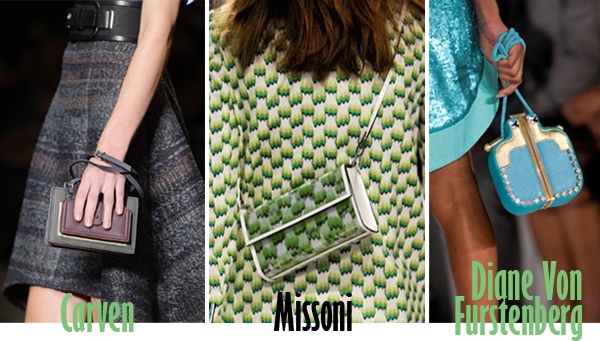 Mini bags are a big trend for Spring/Summer 2013. Offered in various shapes and styles mini bags can be worn on a wrist, behind a back or carried by handles. Diane Von Furstenberg showed whimsical bags at her show, while at Louis Vuitton they were of classic shapes and playful checkered patterns.