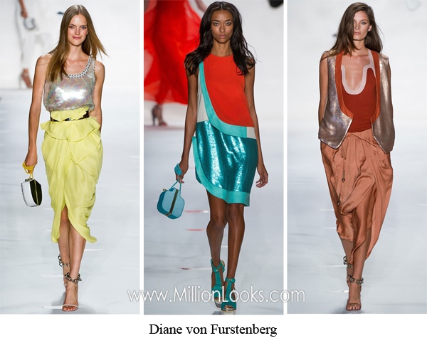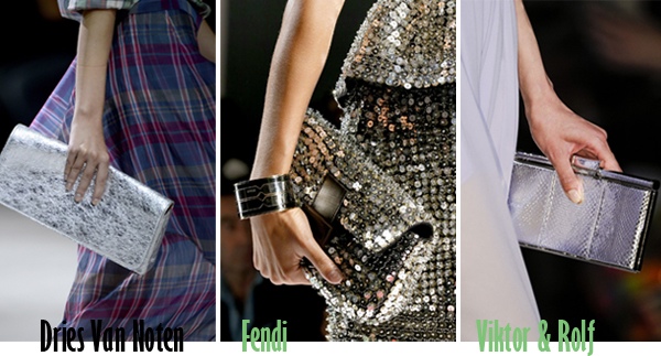 Metallics are everywhere this Spring. There are silver and gold metallic foil shoes, clutches and even clothing items like skirts, jackets and dresses as seen at Burberry Prorsum fashion show. Metallic panels and shiny fabrics also enhance the outfits of such designers as Diane von Furstenberg and Christian Dior.