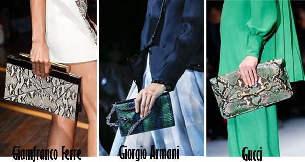 Reptile skins were also all over the runway. From textured croc leather bags at Botega Venetta and Elie Saab to snakeskin and python at Giamfranco Ferre, Gucci, and Giorgio Armani.
