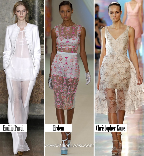 Sheer fabrics and paneling were seen all over the runways during Spring 2013 Fashion Weeks. At Christopher Kane there were sheer fabric overlays while at Emilio Pucci the sheer garments were expertly combined with opaque ones.