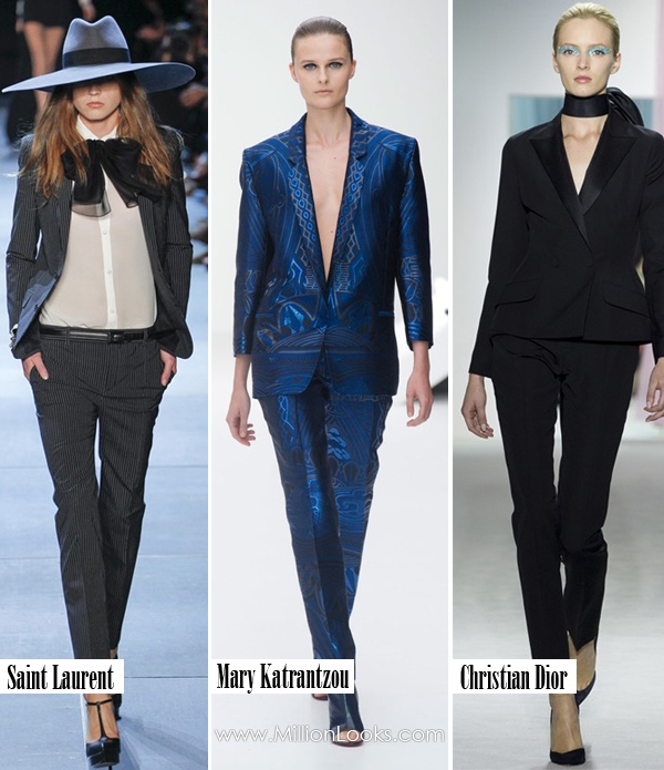 While some designers chose to focus solely on their suits, others went further to complete them with tops and accessories. Saint Laurent showed strict men’s style suits combined with intricate blouses and dramatic bows.