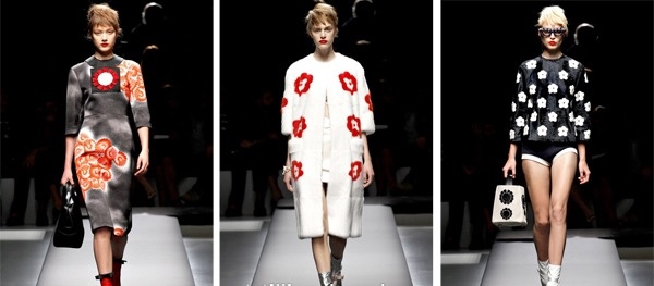 Prada made an accent on minimalistic designs incorporating the bold flower embellishments into monochrome garments.
